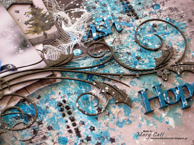 Some splatters with white gesso and microbeads in ”copper” to match with the earth colors to finished my layout.
