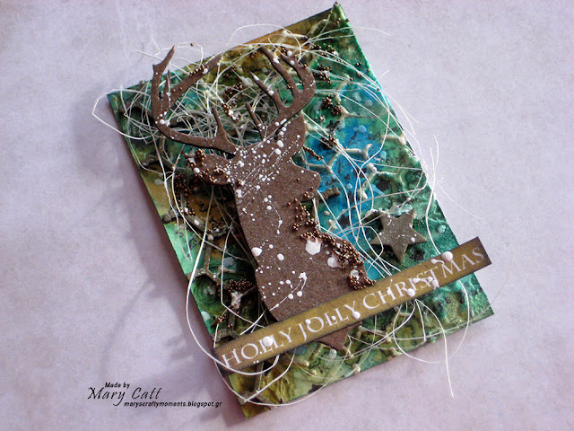 I made the background with a white cardstock colored with ''Tibetan Poppy Teal'', ''Time Travel Teal'', ''Lucky Shamrock Green'' and ''Bayou Boogie Gold'' Lindy's mists.
